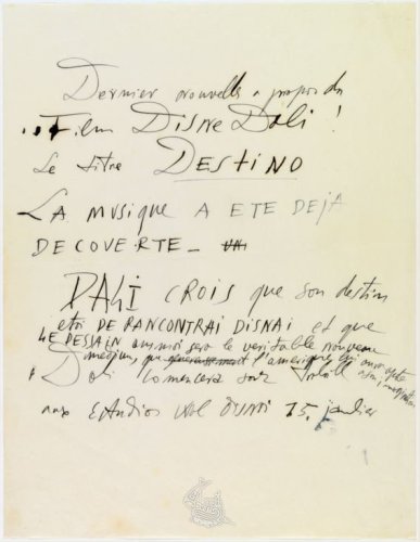 January 14th 1946, Salvador Dali signe a contract with Disney tor Destino an animated short-movie. Following this assignment, the painter take place in Disney’s studio in Burbank, California to start the project, writing and create the storyline and making the drawing.